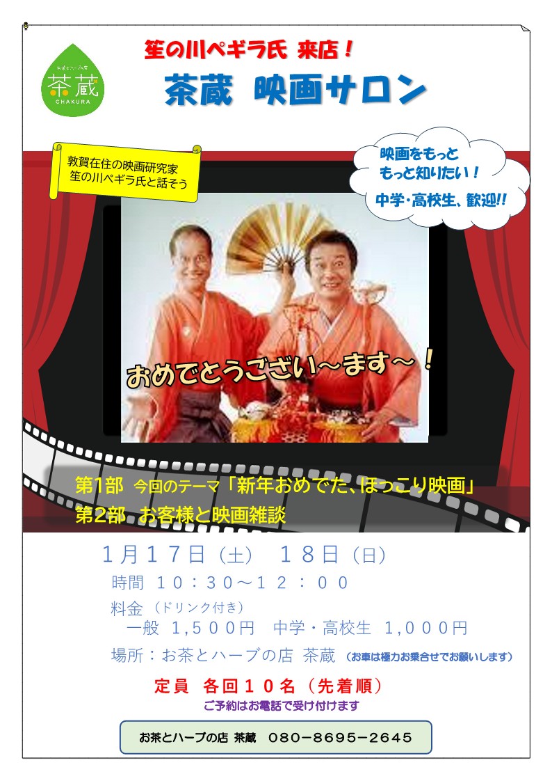 年明け1月の「茶蔵の映画サロン」のご案内です。